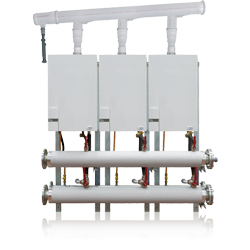 - Το σύστημα συμπεριλαμβάνει: υδραυλικούς συλλέκτες, συλλέκτες αερίου, εκκένωσης καυσαερίων και συμπυκνωμάτων, πλακέτα διαχείρισης σε σειρά με εξωτερικό αισθητήρα και πλαίσιο στήριξης